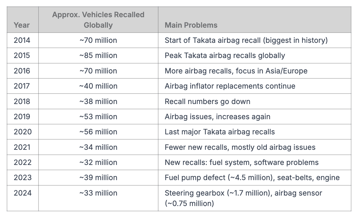 Recalls often involve serious safety risks. For example, the Takata airbag problem led to over 20 deaths and 300 injuries worldwide. In recent years, recalls have included steering, brakes, and fuel pumps, which can all cause accidents if not fixed.