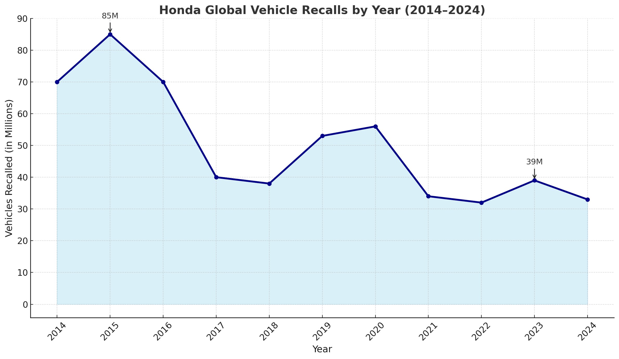From 2014 to 2024, Honda recalled over 550 million vehicles globally because of serious problems. One of the largest recalls was for Takata airbags, which sometimes broke and caused injuries or death.